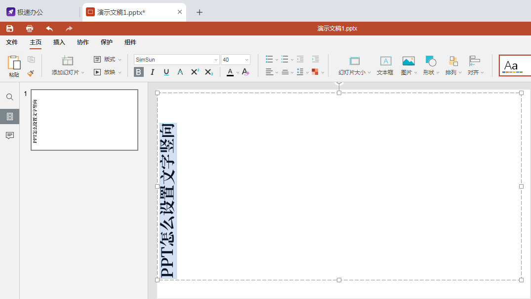 用speedoffice打开PPT文件,光标放在需要设置成竖向的文字处,右键鼠标,出现的选项卡里面选择“文字方向”并在出现的子菜单栏里面选择“旋转270°” [](speedoffice.cn) 上述操作完毕即可看到文字已经竖向排列。  **Speedoffice - 官网下载:** [](https://speedoffice.cn/?ch=help "Speedoffice - 官网下载")