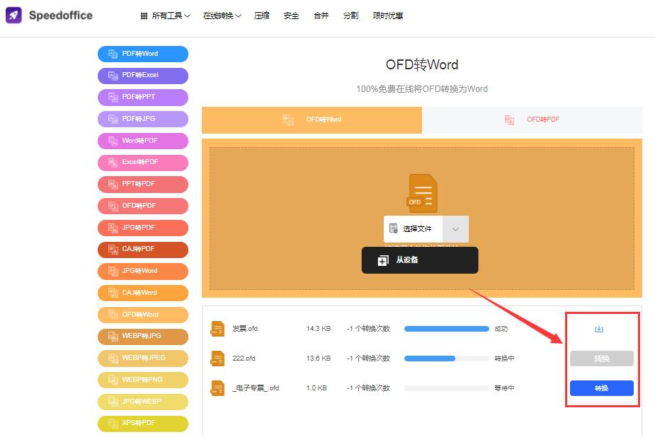 工具:speedoffice在线免费转换 操作方法: 首先搜索speedoffice找到这个免费在线转换工具打开。 在首页找到并选择OFD转Word进入转换,点击选择文件并添加OFD文件,可一次选择多个文件添加。 添加后在下方列表中分别点击每个文件后的转换。  等待一会儿,转换完成后点击下载按钮即可。整个过程不用安装也无需注册登录,手机和电脑都能免费转换。 如果你更习惯软件转换,也可以在首页安装它的客户端,打开软件后点击左侧工具栏的“转换”切换到转换功能,同样的操作进行转换,转换完成后点击下载即可; **Speedoffice - 官网下载:** [](https://speedoffice.cn/?ch=help "Speedoffice - 官网下载")