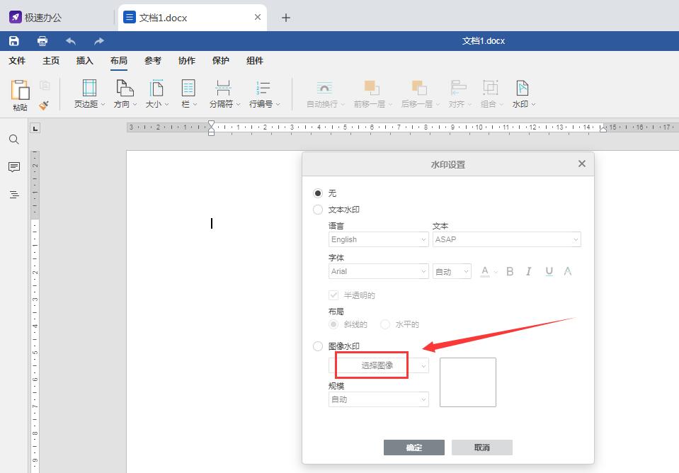 首先运行speedoffice软件,点击“打开文件”或在“最近使用文件”中单击打开需要修改的Word文档。 然后依次点击菜单栏中的“布局”-“水印”,在下拉选项选择“自定义水印” 在水印设置窗口勾选“图像水印”,点击“选择图像”-“从文件导入”并添加提前准备好的图片,将规模勾选为“100%”后点击“确定”。  回到Word文档中可以看到背景图片已经添加好了。 如需删除只需再次点击“水印”并选择“删除水印”即可。 **Speedoffice - 官网下载:** [](https://speedoffice.cn/?ch=help "Speedoffice - 官网下载")